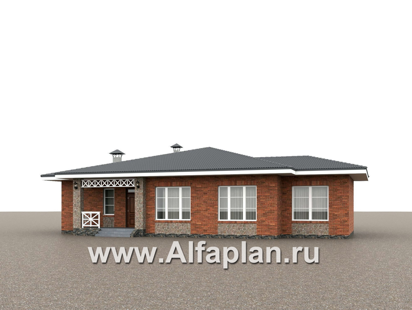 666A-2-S «Горизонталь» - проект одноэтажного дома с террасой, в немецком стиле, баварская кладка