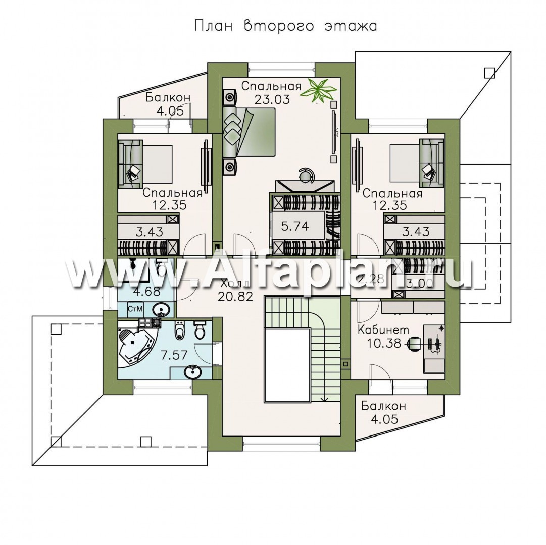 Пространство второго этажа, согласно проекту дома из пустотного кирпича (газо-, пенобетона), целиком отдано под приватную группу. Она представлена тремя спальнями, две из которых имеют равную площадь, а также кабинетом. Родительскую спальню предполагается оборудовать помещением под гардеробную, одна из малых спален и кабинет имеют выходы на собственные балконы. В небольшом тамбуре между помещениями со стороны левого фасада предполагается обустроить общую гардеробную.