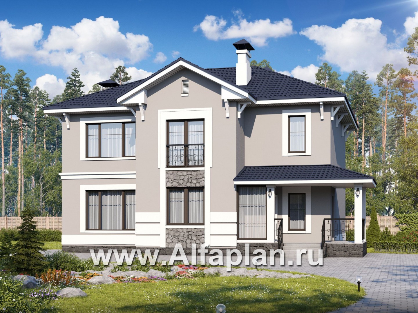 Этот проект коттеджа имеет интересный «ступенчатый» периметр. Второй этаж построен в полную высоту, он не является мансардным. Фасад декорирован штукатуркой и крупным облицовочным камнем холодных оттенков, которые эффектно сочетаются с темной черепицей. Козырек над крыльцом оформлен по аналогии с крышей, сливается с ней в едином ансамбле.