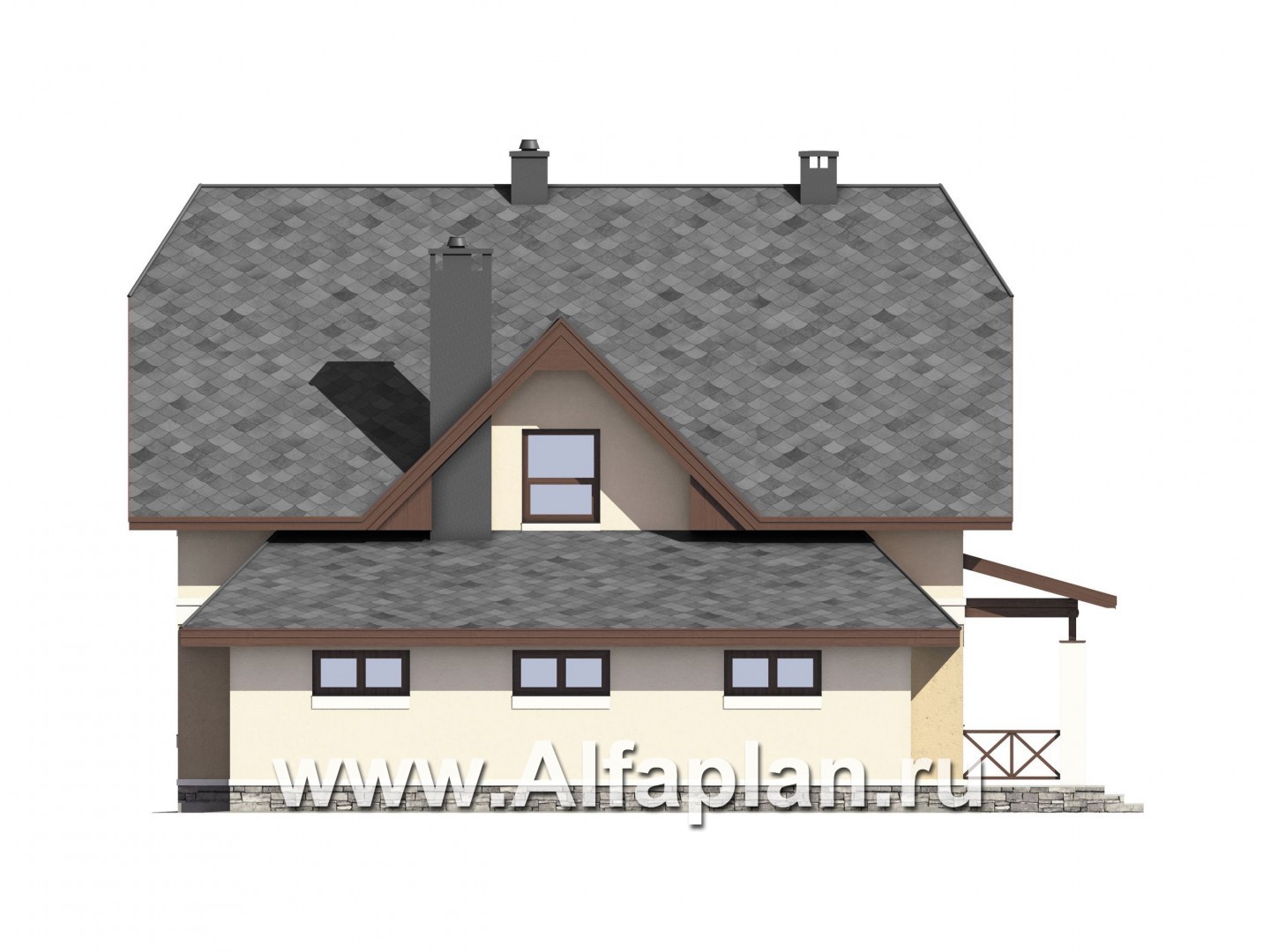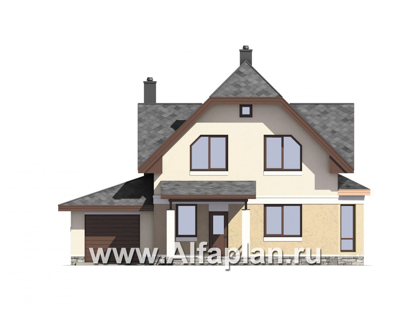 Проект дома с мансардой, планировка с террасой и кабинетом на 1 эт, с эркером и с гаражом на 1 авто