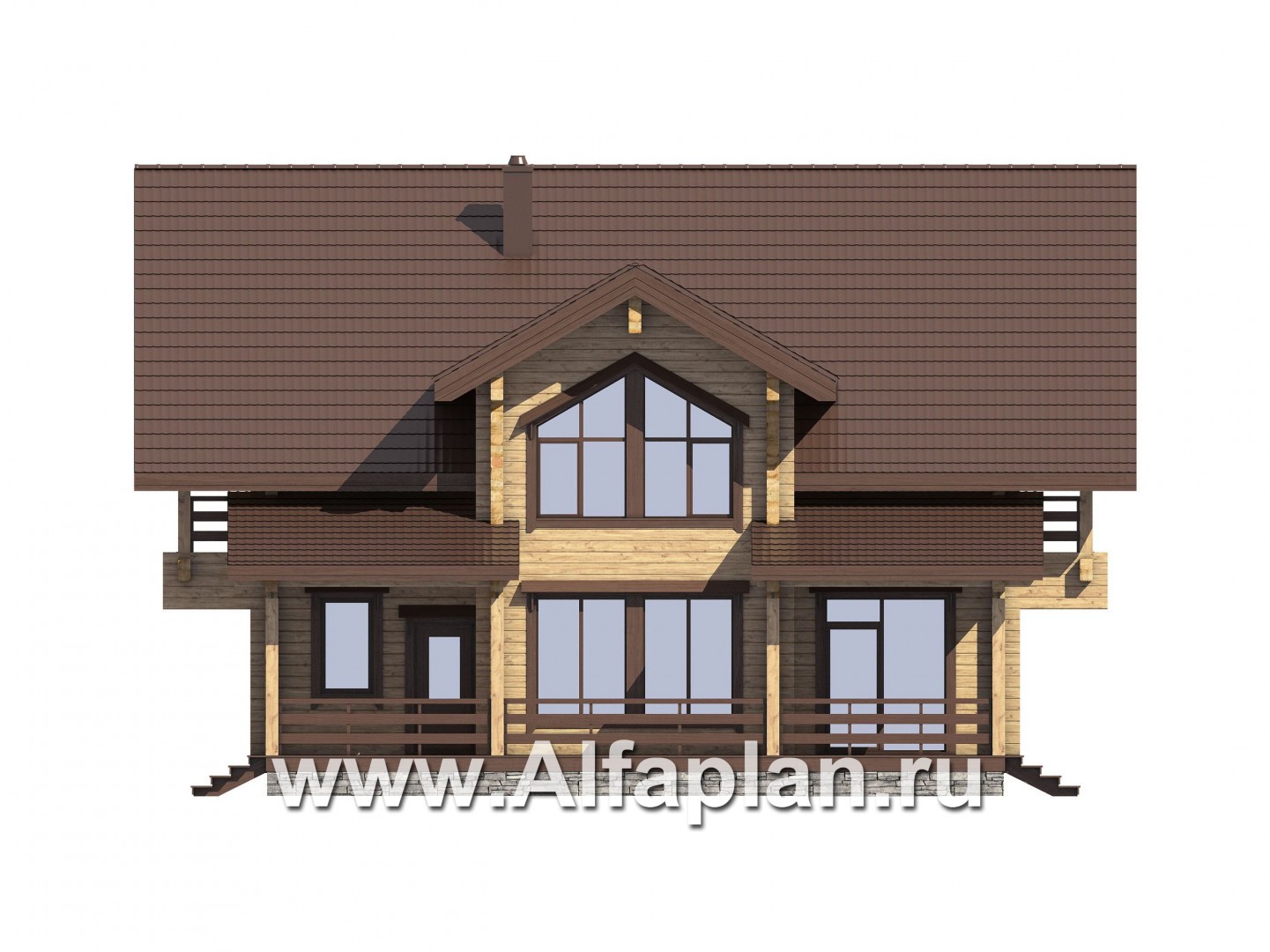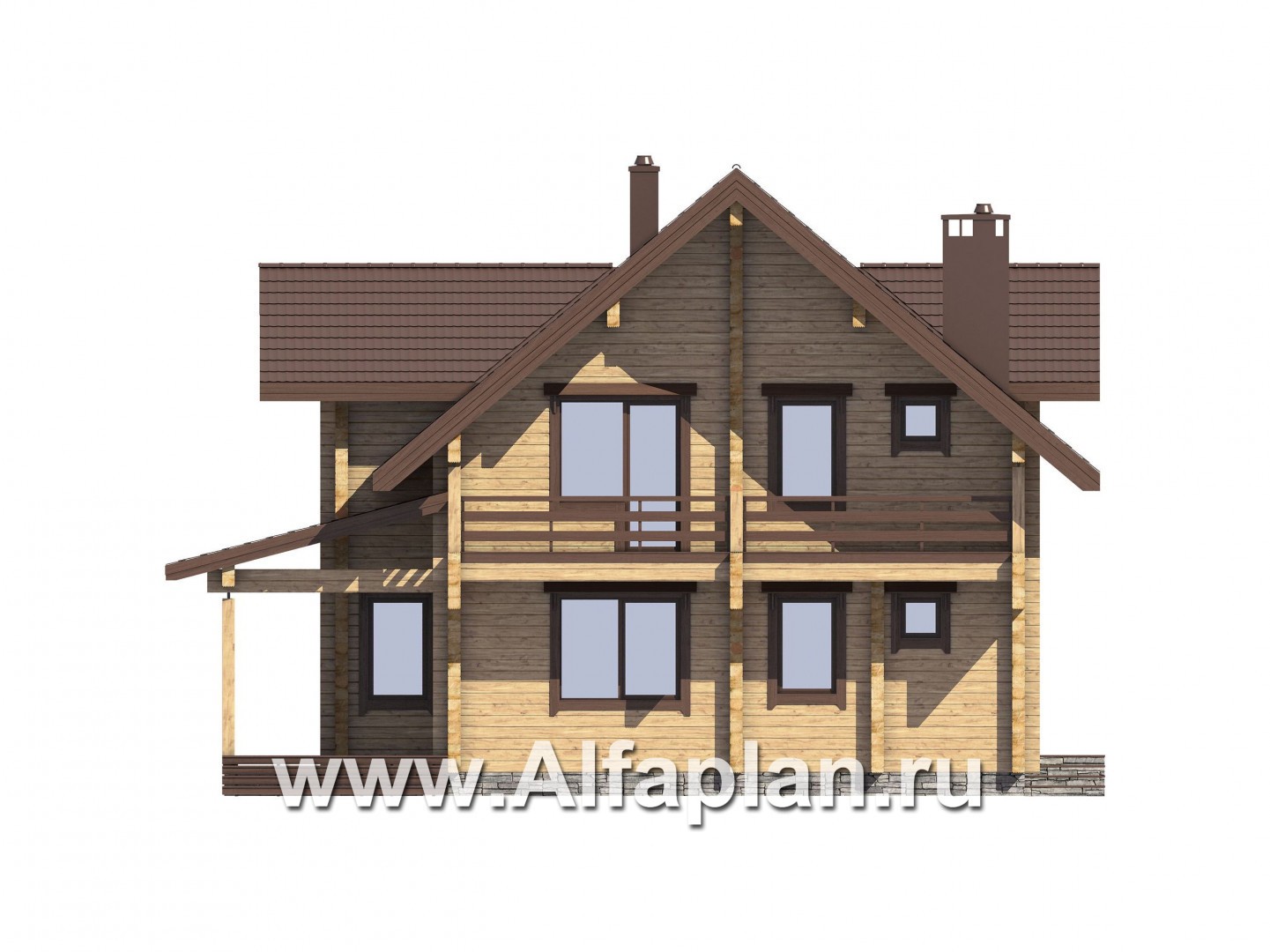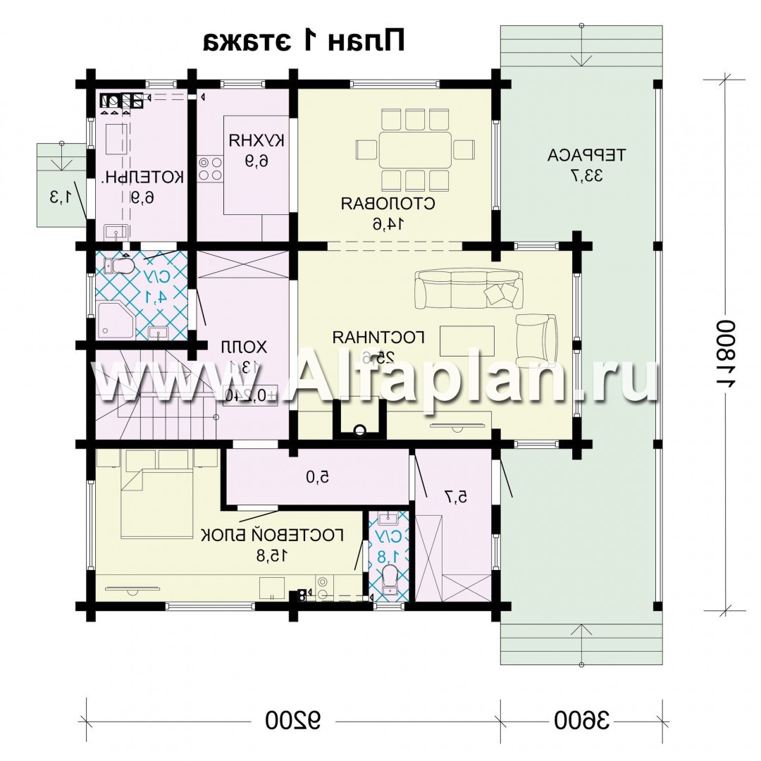 Проект дома с мансардой, из бруса, планировка с террасой и с гостевой квартирой на 1 эт