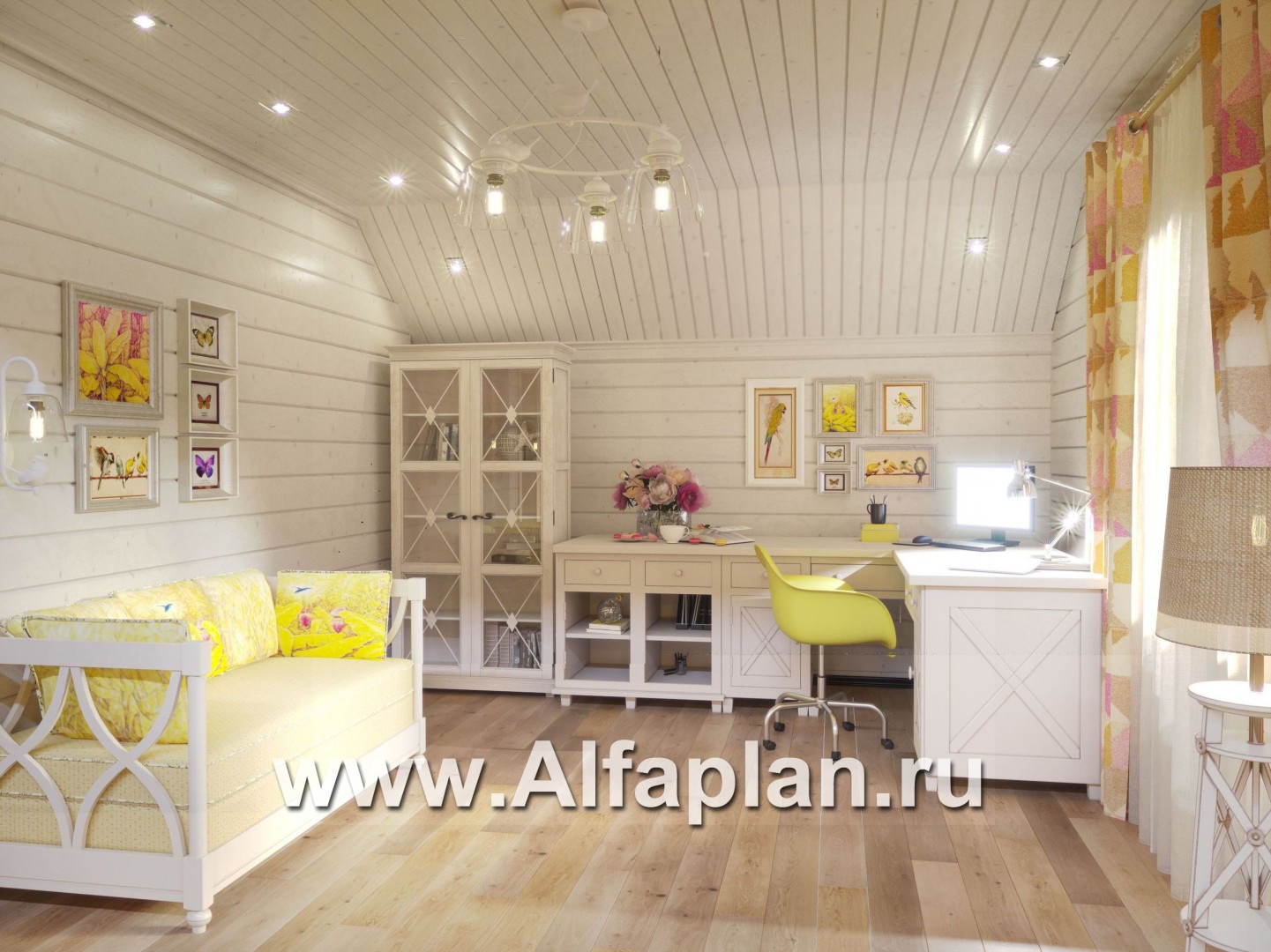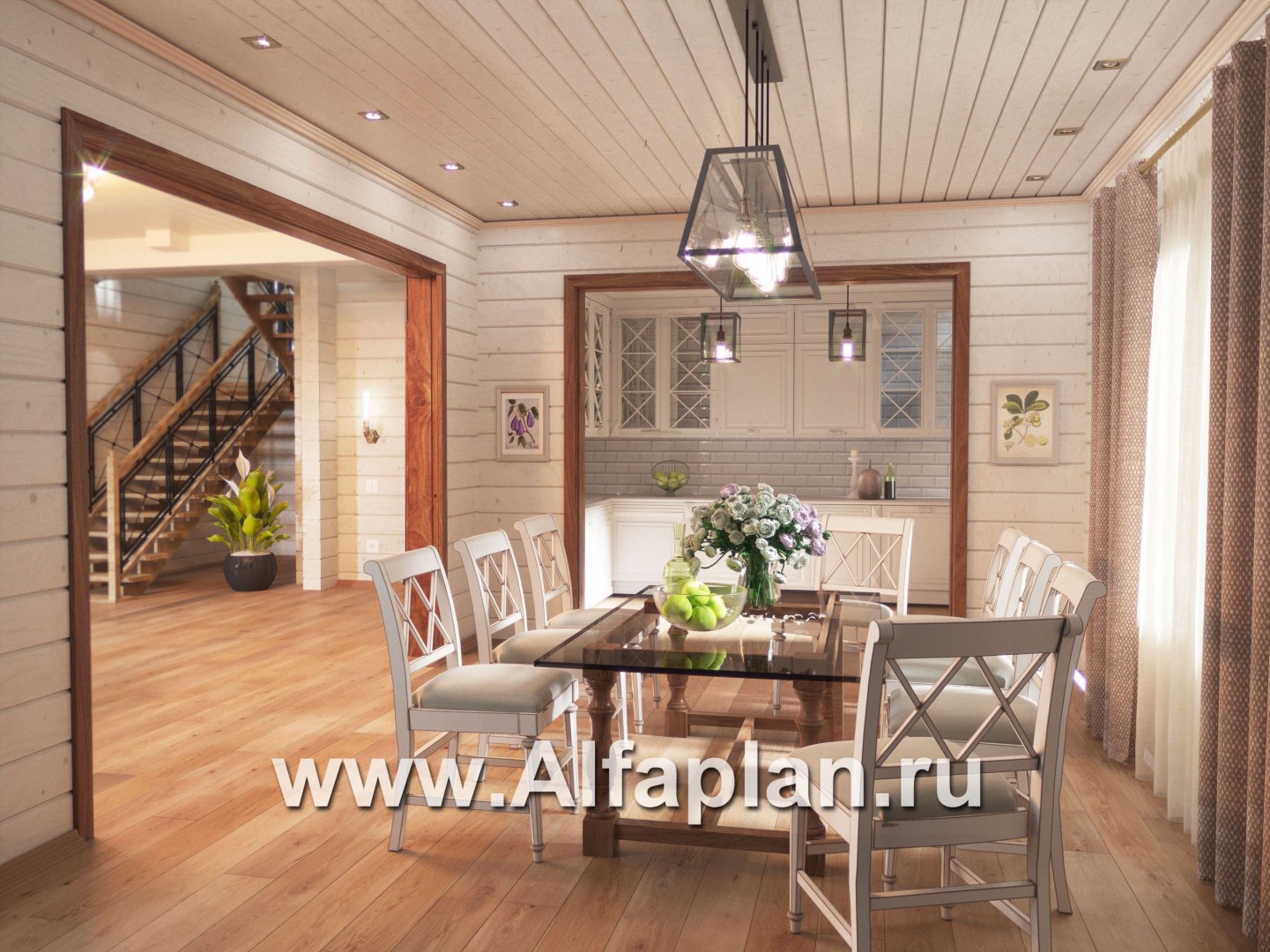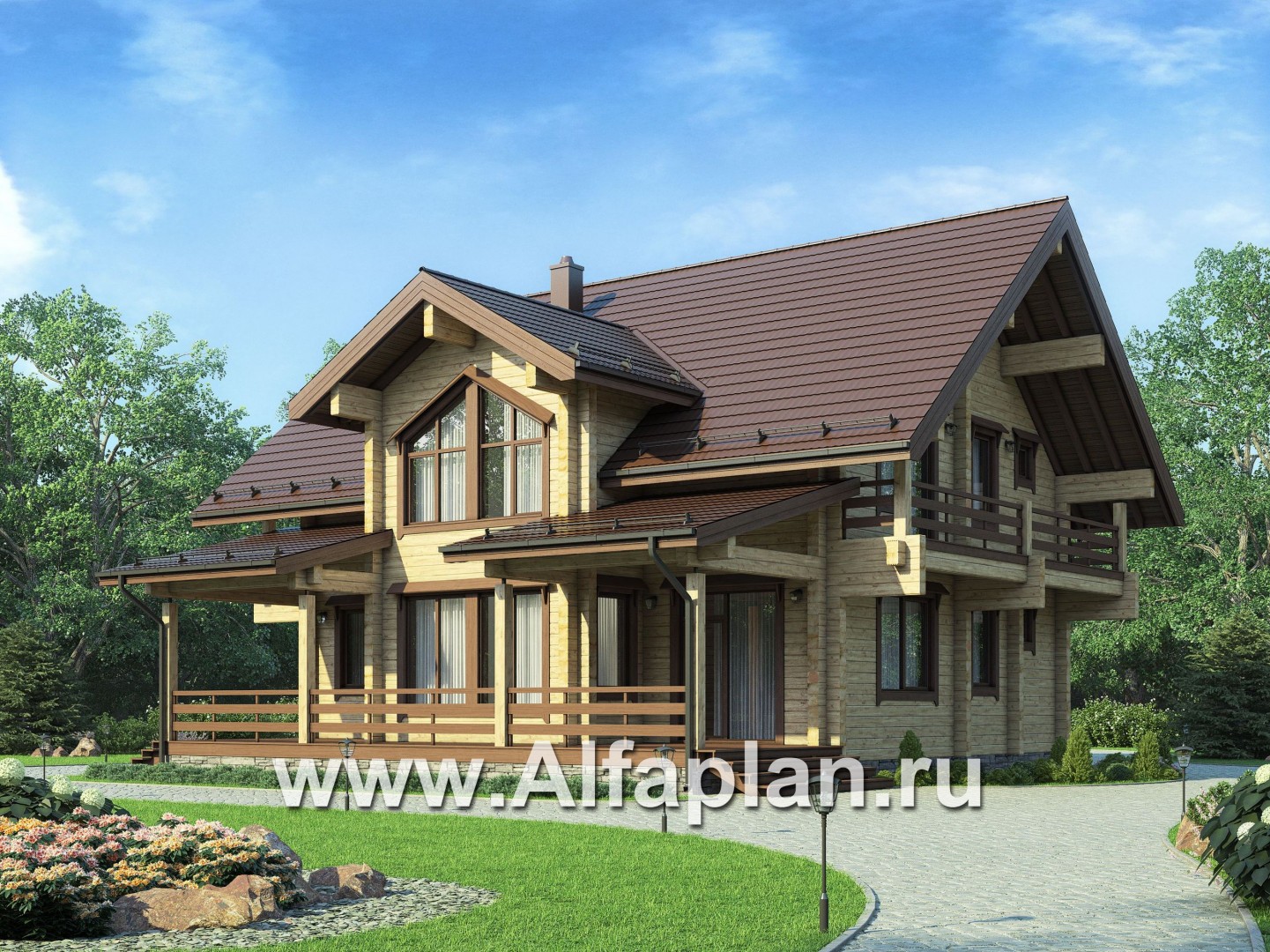 Проект дома с мансардой, из бруса, планировка с террасой и с гостевой квартирой на 1 эт